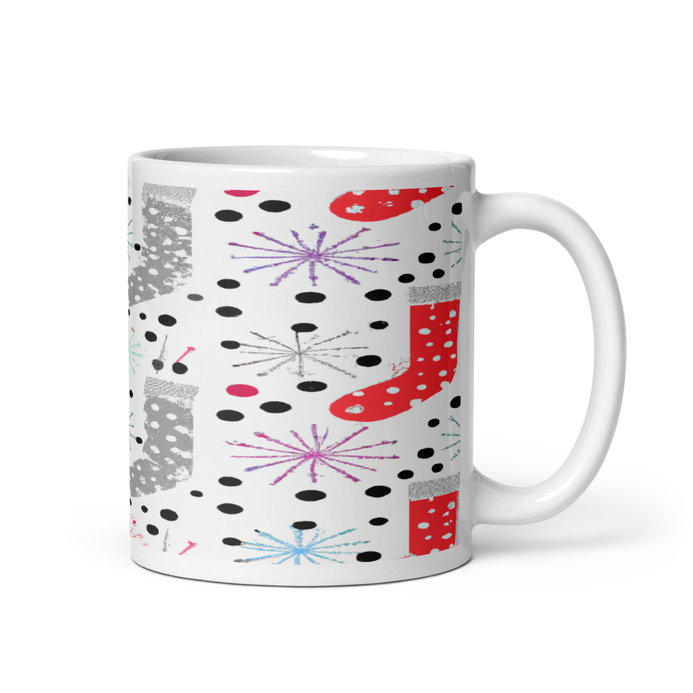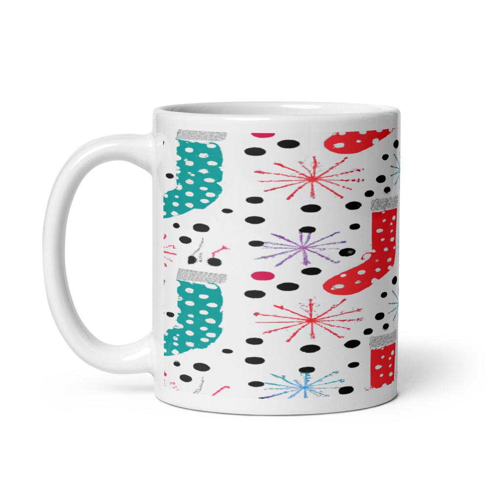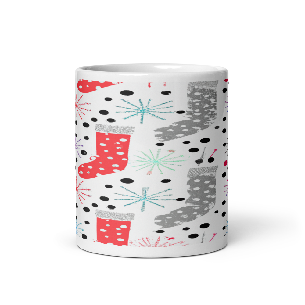Festive Holiday Mug: Christmas Stockings, Fireworks, and Snowflakes Design