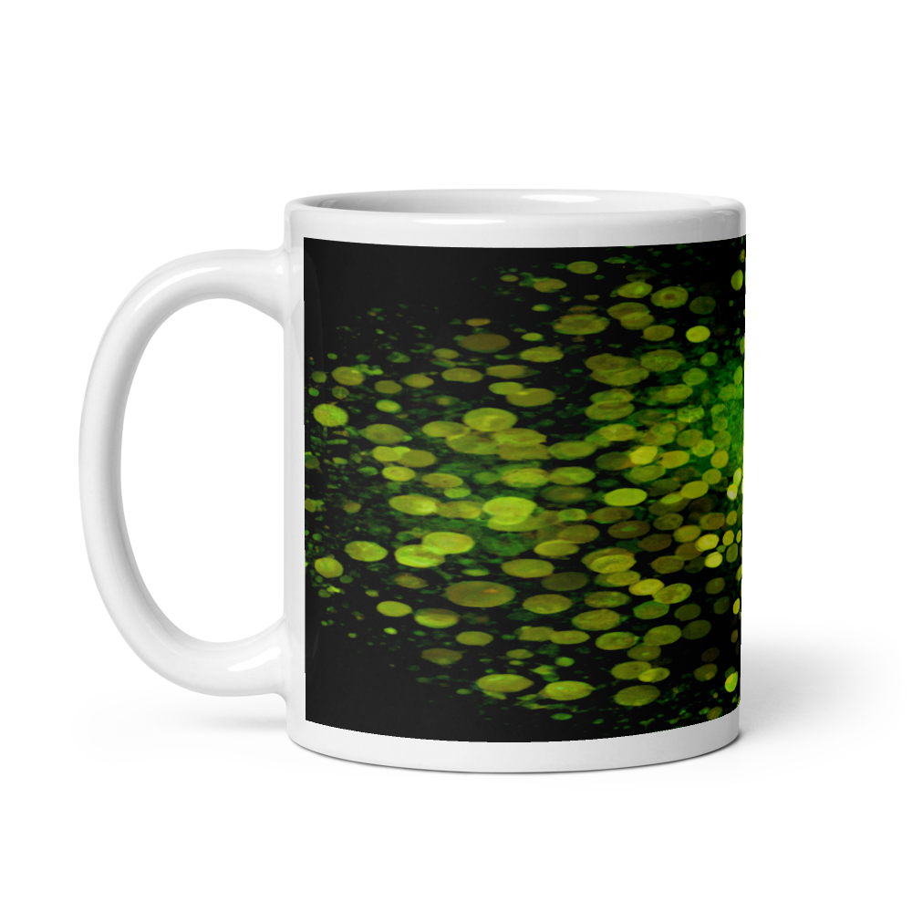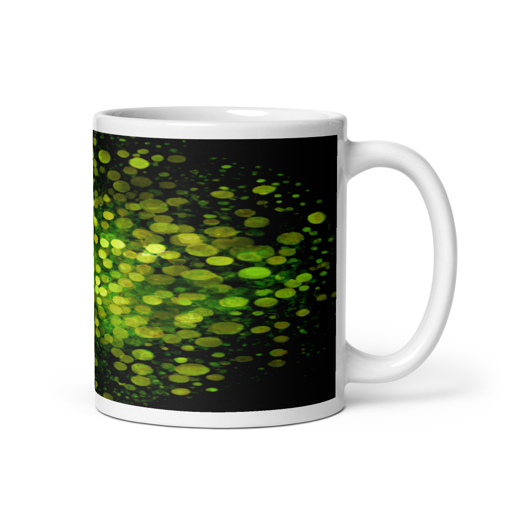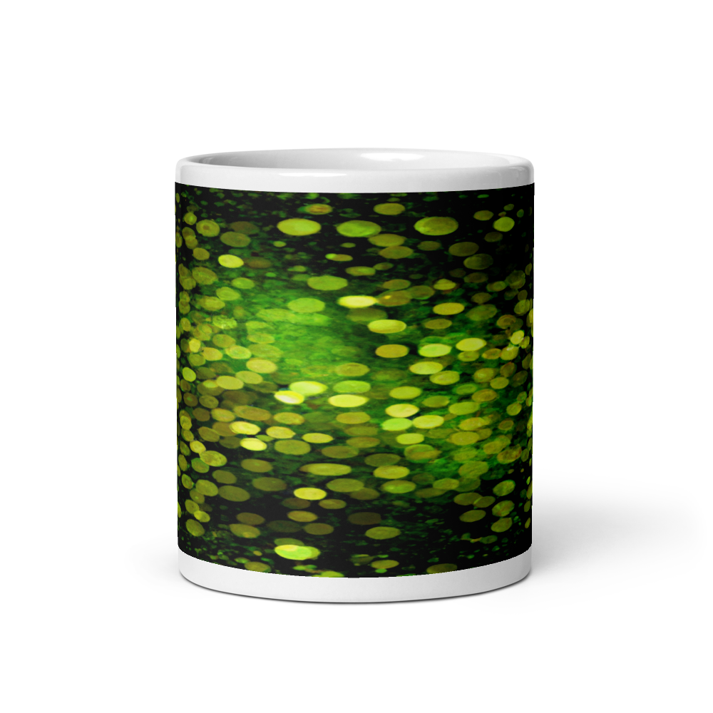 – Features a sparkling digital art piece of glowing dots and circles in shades of green and gold