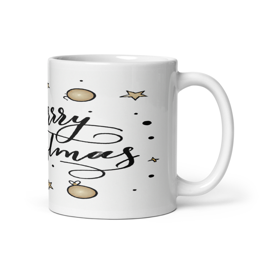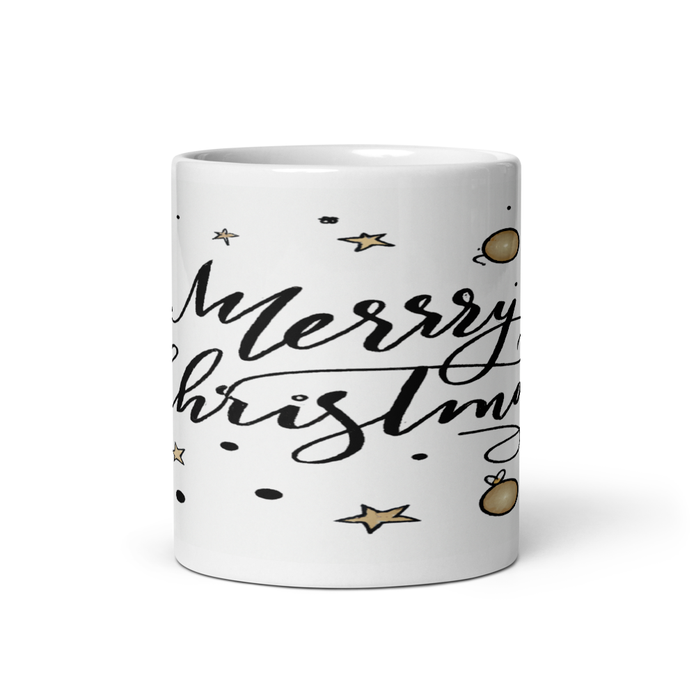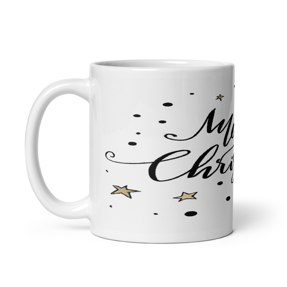 Merry Christmas Calligraphy Ceramic 11oz Mug – Dotted Stars & Ornaments Design