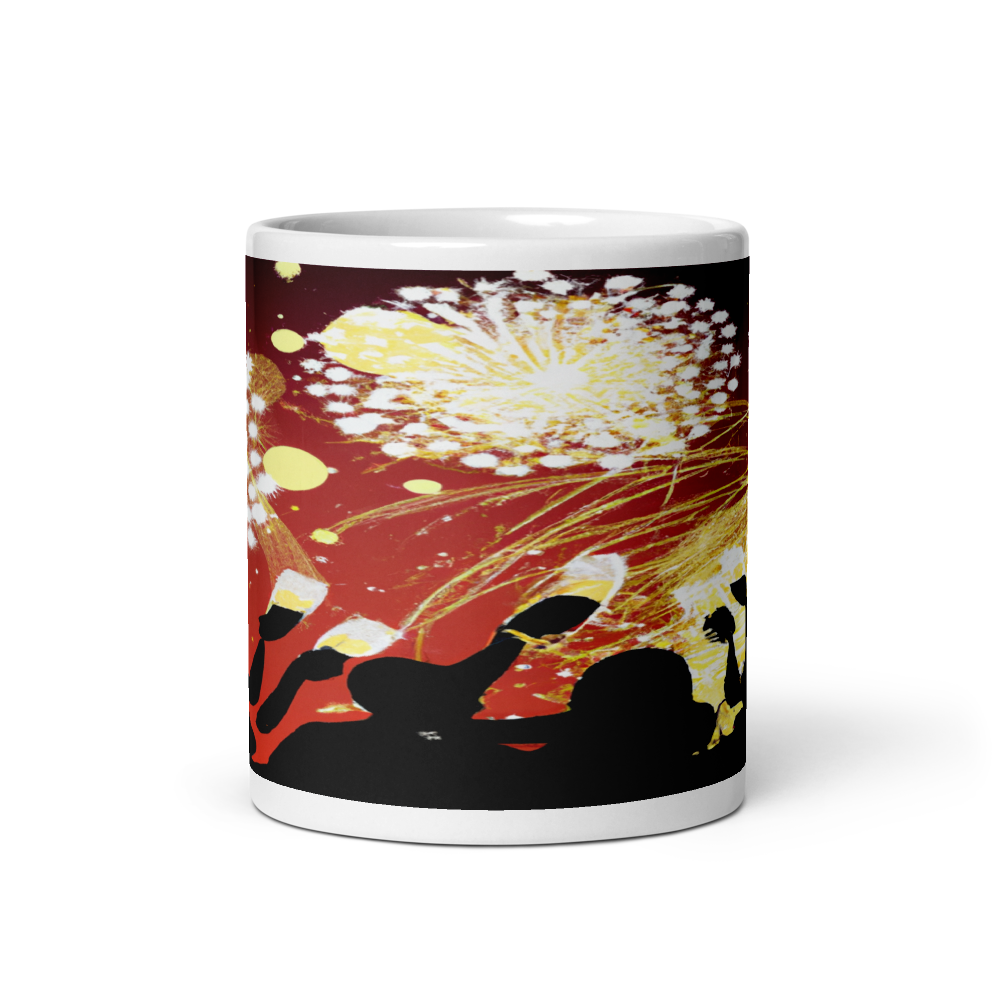 – Features guests raising champagne glasses under a sky full of dotted fireworks and glowing circles