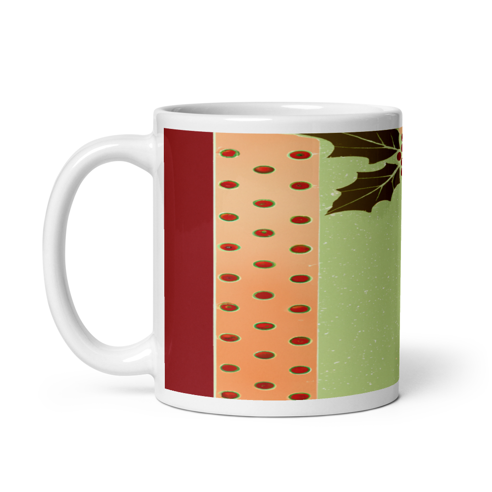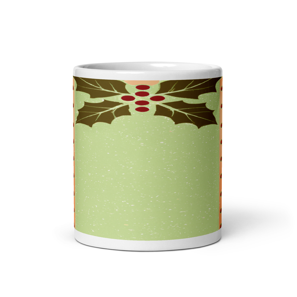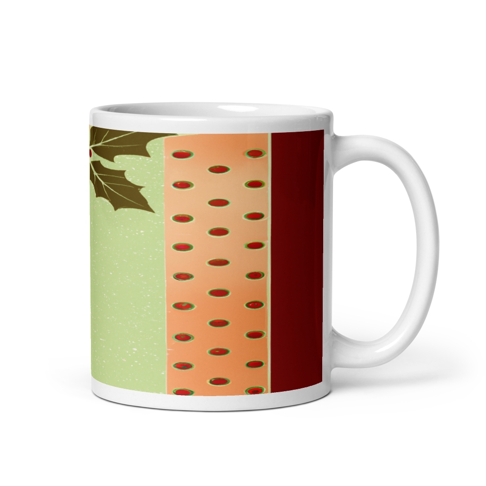 Retro Christmas Holly Leaves 11oz Ceramic Mug with Shimmering Gold Dots