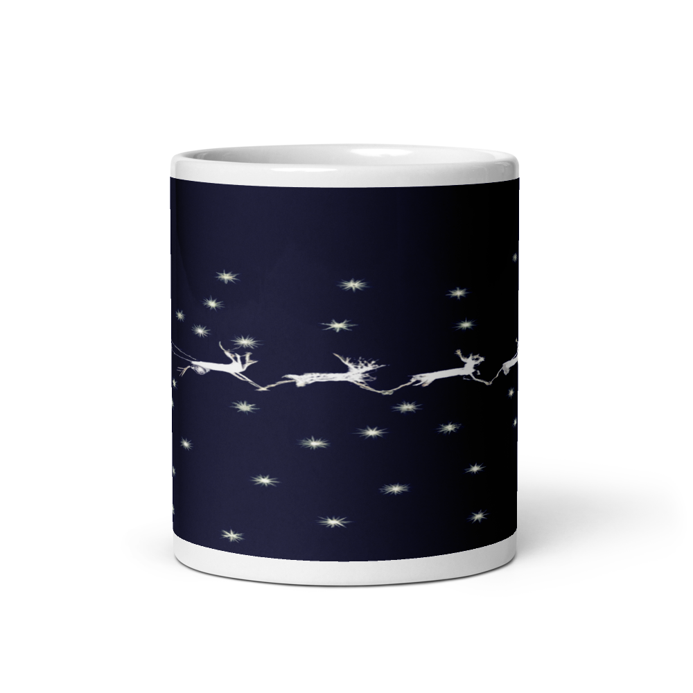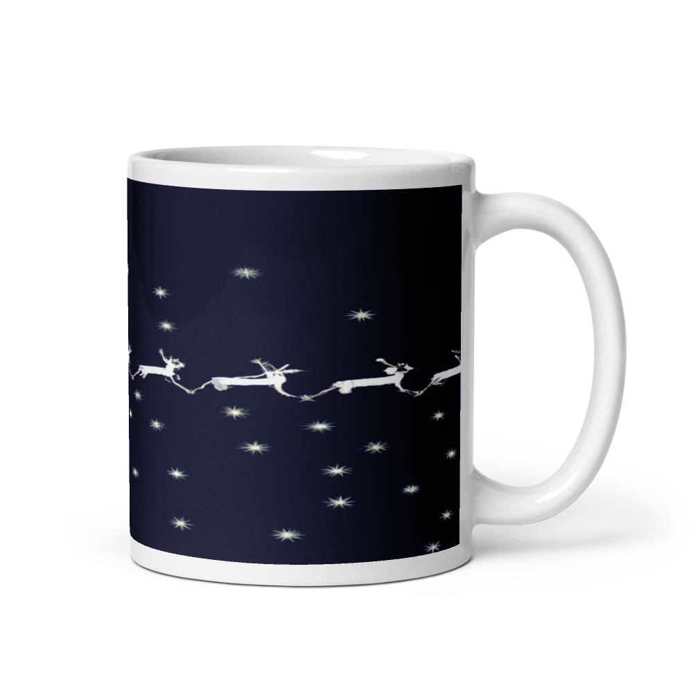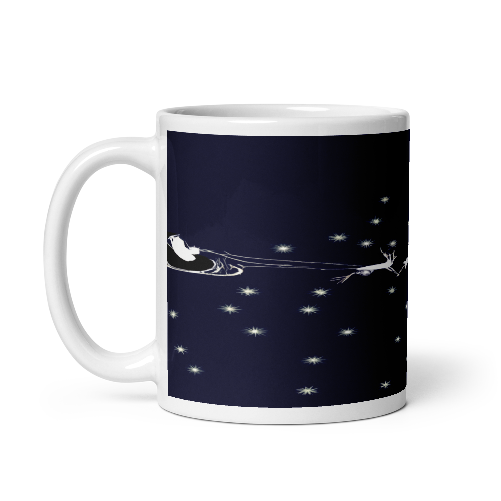 – Features a minimalist illustration of Santa Claus flying through the night sky on his sleigh