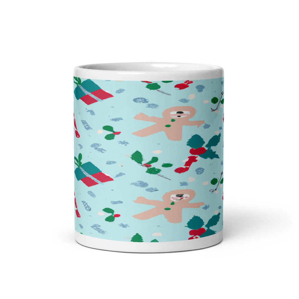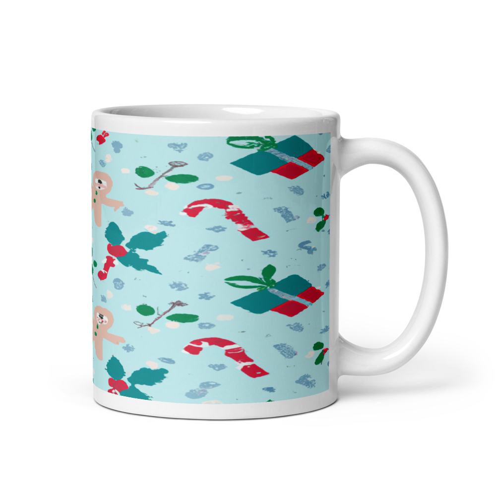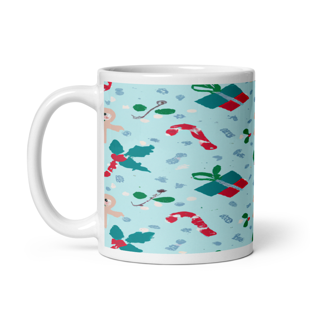 – Enjoy your favorite beverage in this whimsical mug featuring a dotted pattern of candy canes, holly leaves, and gingerbread men