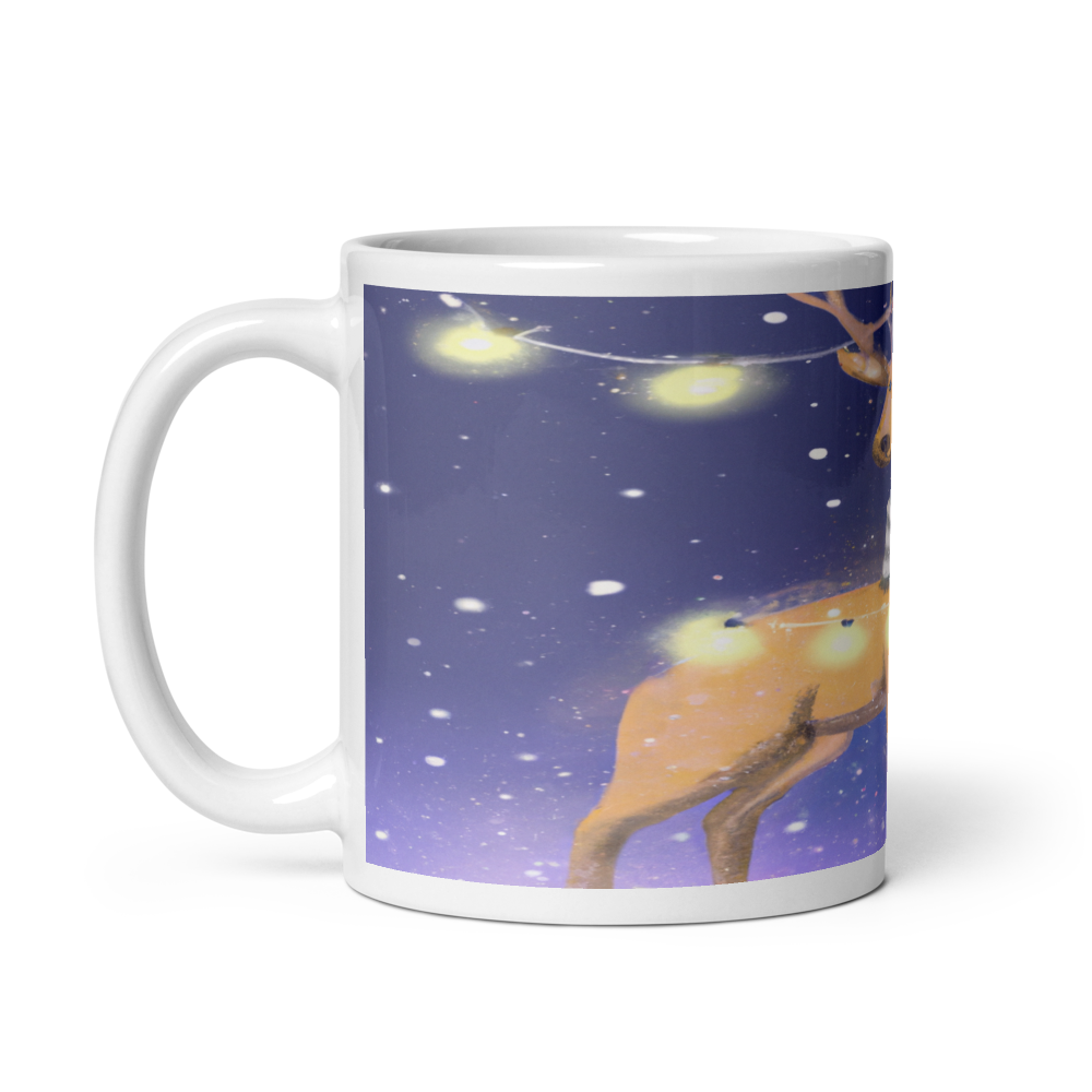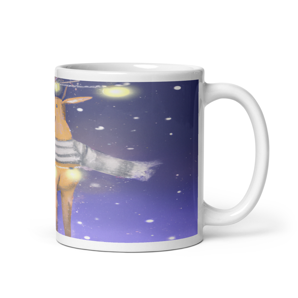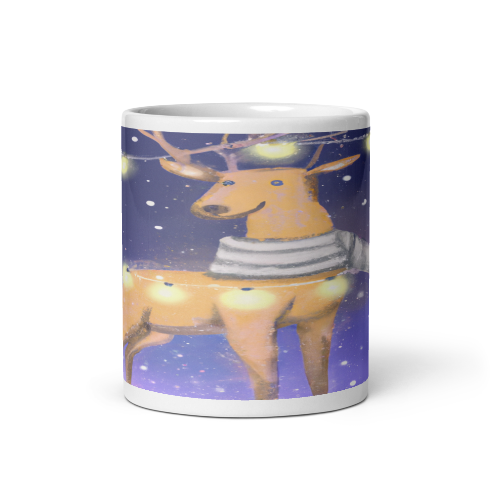 Whimsical Reindeer 11oz Ceramic Mug with Dotted Scarf and Fairy Lights